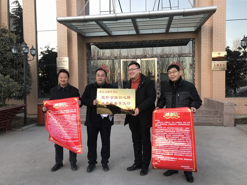 近日,輝縣市教育局副局長(zhǎng)王琪一行代表教育局黨委來(lái)到輝縣市店,他們給該店送來(lái)了一個(gè)抱樸守拙初心路,書(shū)香花香熏太行,并送來(lái)感謝信一封,充分肯定了輝縣市店2017年的工作,并對(duì)店多年來(lái)對(duì)教育工作的支持表示感謝。這是輝縣市教育局連續(xù)三年給該店送來(lái)牌匾和感謝信。