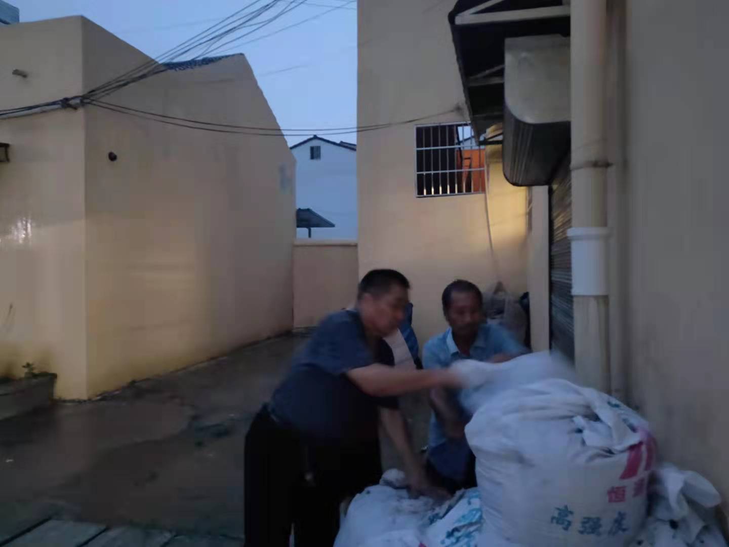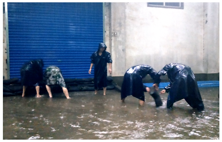 鄭州市新華書店員工用沙袋構(gòu)筑防水臺,防止雨水倒灌至購書中心地下倉庫