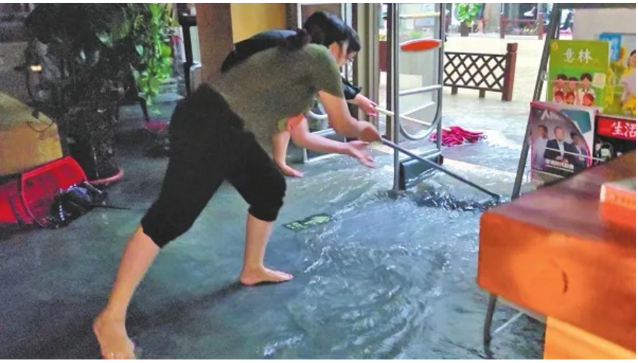 暴雨中,鄭州市新華書店中原萬達店員工正在用拖把往外推水,拼盡全力搶救圖書等物資