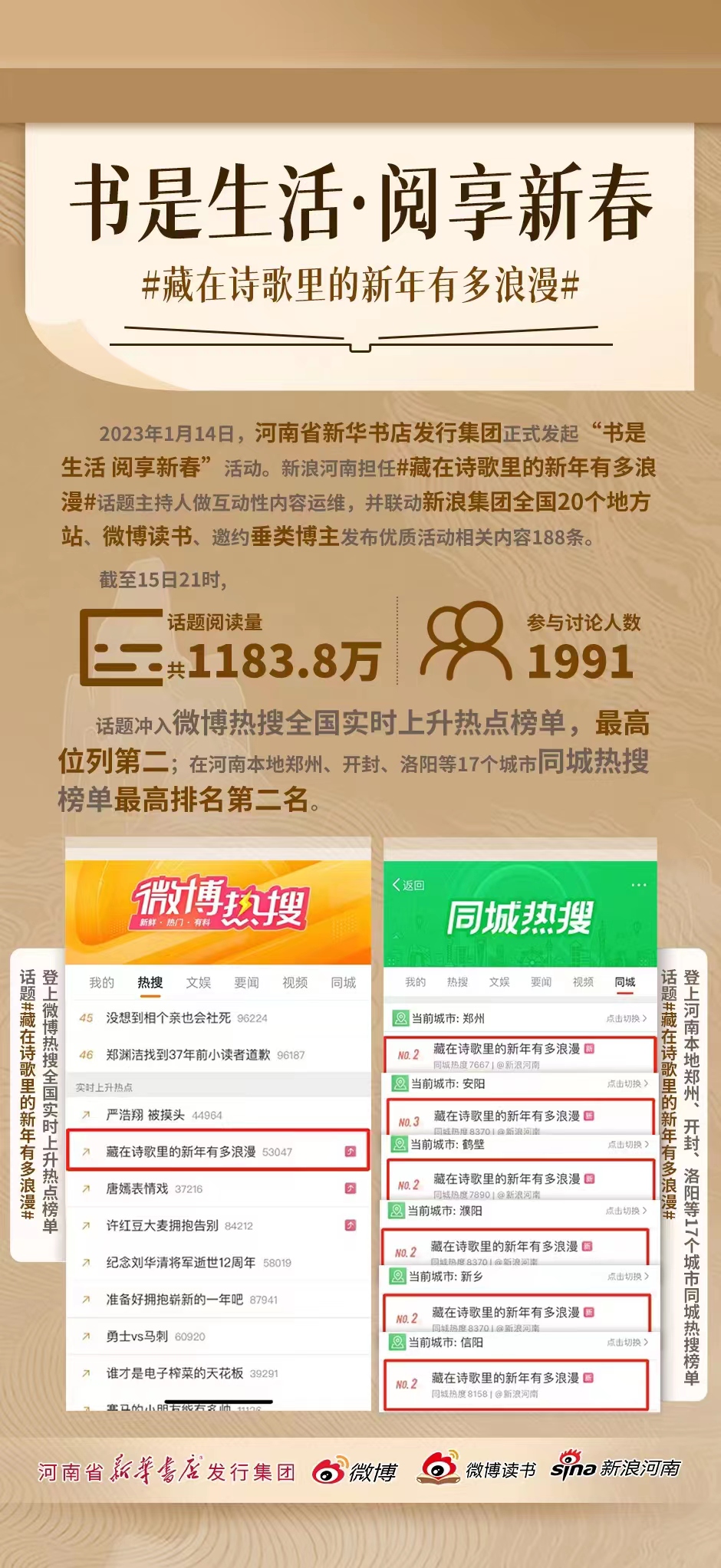《百家講壇》主講教授王士祥、豫教音像社總編輯張瑞芳、朗誦名家肖灑等大咖做客尚書(shū)房海匯港店,把書(shū)香帶入年味兒,讓我們的節(jié)日更加有文化厚度,當(dāng)天活動(dòng)微博話題獲得全網(wǎng)970萬(wàn)閱讀,精彩的活動(dòng)內(nèi)容讓線上線下的廣大讀者紛紛點(diǎn)贊,躍居全國(guó)實(shí)時(shí)榜和同城熱搜榜第2位。至此,“詩(shī)詞里的年味兒”活動(dòng)拉開(kāi)了河南新華書(shū)店新春閱讀推廣序幕。
