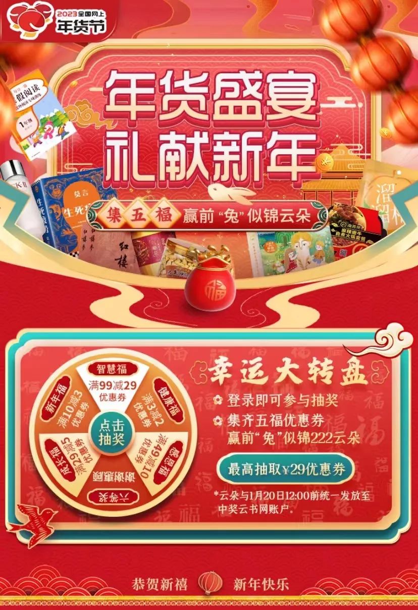 讀者還可參與云書(shū)網(wǎng)線上商城“集五福”得前“兔”似錦222云朵營(yíng)銷活動(dòng);還有新年禮遇新人、紅包文創(chuàng)用品買(mǎi)1贈(zèng)1等線上線下活動(dòng),更有超多圖書(shū)折扣,優(yōu)惠券等你拿。1月25日-1月27日,云書(shū)網(wǎng)將開(kāi)展“新春讀好書(shū),文化過(guò)大年”直播帶貨活動(dòng),關(guān)注“河南新華書(shū)店直播間”,每天精彩直播為你推薦正版福利好書(shū),與主播互動(dòng)可享更多優(yōu)惠哦。