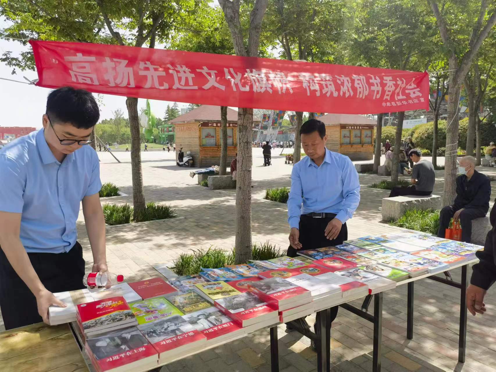 5月1日清早,中牟縣店中興路店的幾名營業(yè)員已經(jīng)來到了綠博園景區(qū)內(nèi),熟練地支起簡易展臺(tái),整齊擺放好了圖書。書展吸引了晨練的人們,大家紛紛駐足翻閱,營業(yè)員張春興熱情地向讀者們介紹著每本書。