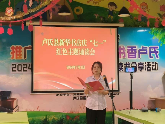 7月3日,盧氏縣店舉辦慶“七一”紅色主題誦讀會(huì),百姓文化盧氏云進(jìn)行現(xiàn)場(chǎng)直播。誦讀會(huì)內(nèi)容豐富、形式多樣,《跨越百年的承諾》《紅色的七月》《紅船的方向》等精彩節(jié)目依次上演,黨員干部們用朗朗書聲為黨慶生,歌頌中國(guó)共產(chǎn)黨的偉大成就,現(xiàn)場(chǎng)氣氛和諧熱烈。