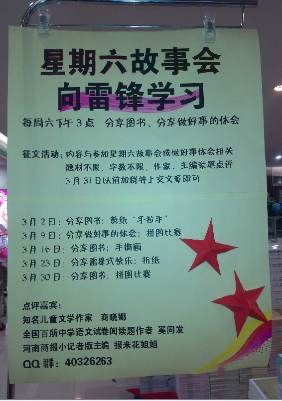 伴隨著春節(jié)長假的遠去,三月份如期而至,同時該月又是學雷鋒月,鄭州市店為大力弘揚雷鋒精神,充分利用自身營銷品牌——“星期六故事會”這一平臺,開展為期一個月的“向雷鋒學習”主題活動。