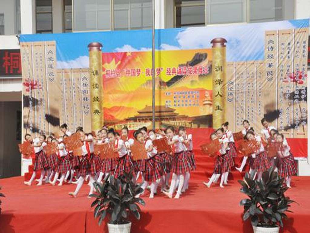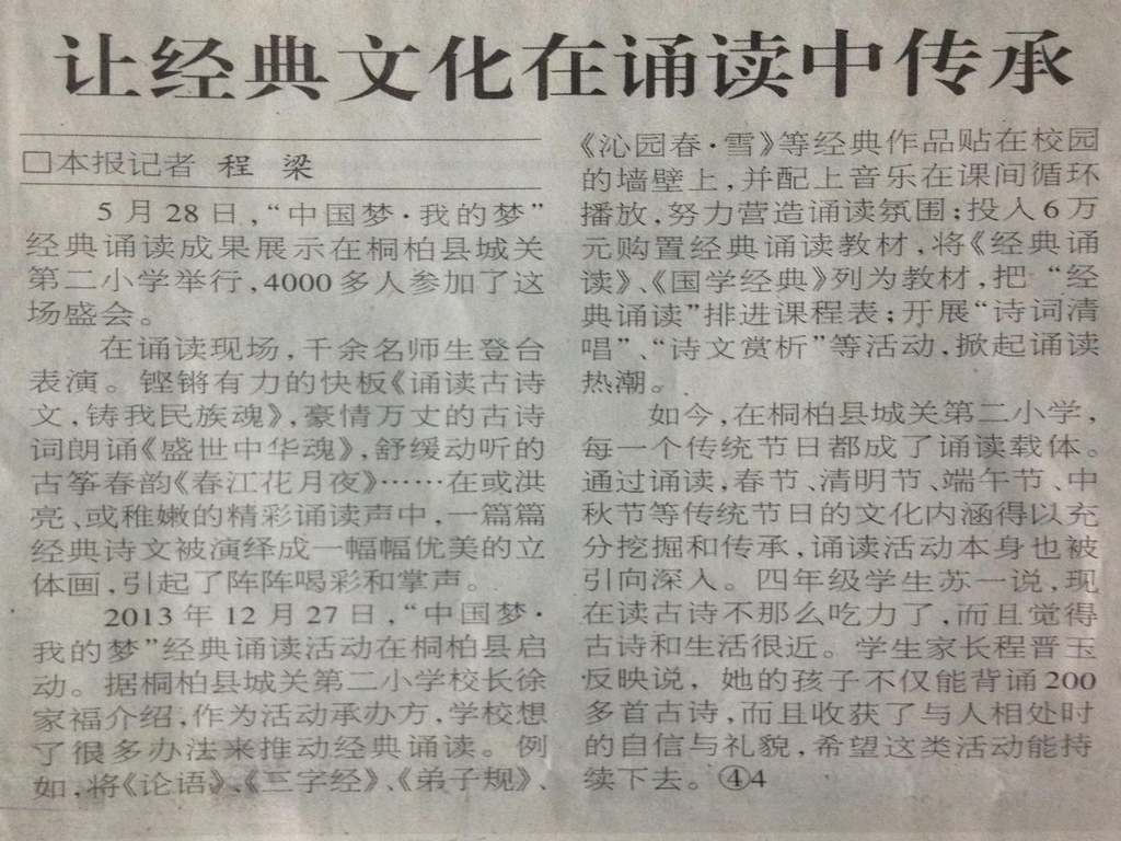 2013年12月27日,桐柏縣“中國夢·我的夢”經(jīng)典誦讀活動啟動。此次經(jīng)典誦讀活動以桐柏縣店店校聯(lián)辦讀者俱樂部為平臺,以了解中國傳統(tǒng)文化、汲取民族智慧為出發(fā)點,進一步豐富完善讀者俱樂部的服務功能,使之真正成為“未成年人思想道德建設教育基地”。日前,桐柏縣“中國夢·我的夢”經(jīng)典誦讀成果展示活動在城關二小舉辦。在誦讀展演中,豐富的表現(xiàn)形式,加上孩子們精彩的誦讀,飽滿的熱情,高昂的激情,充分展現(xiàn)了古詩文朗誦的藝術感染力和舞臺表現(xiàn)力,展現(xiàn)了中華經(jīng)典穿越時空的恒久魅力。