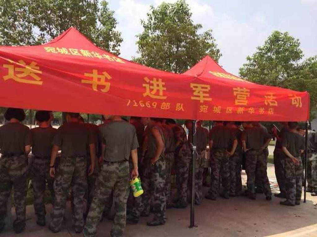為慶!鞍艘弧苯ㄜ姽(jié),宛城區(qū)店組織員工利用節(jié)假日,不畏酷暑,頂著烈日,開展“送書進軍營”慰問展銷活動。
