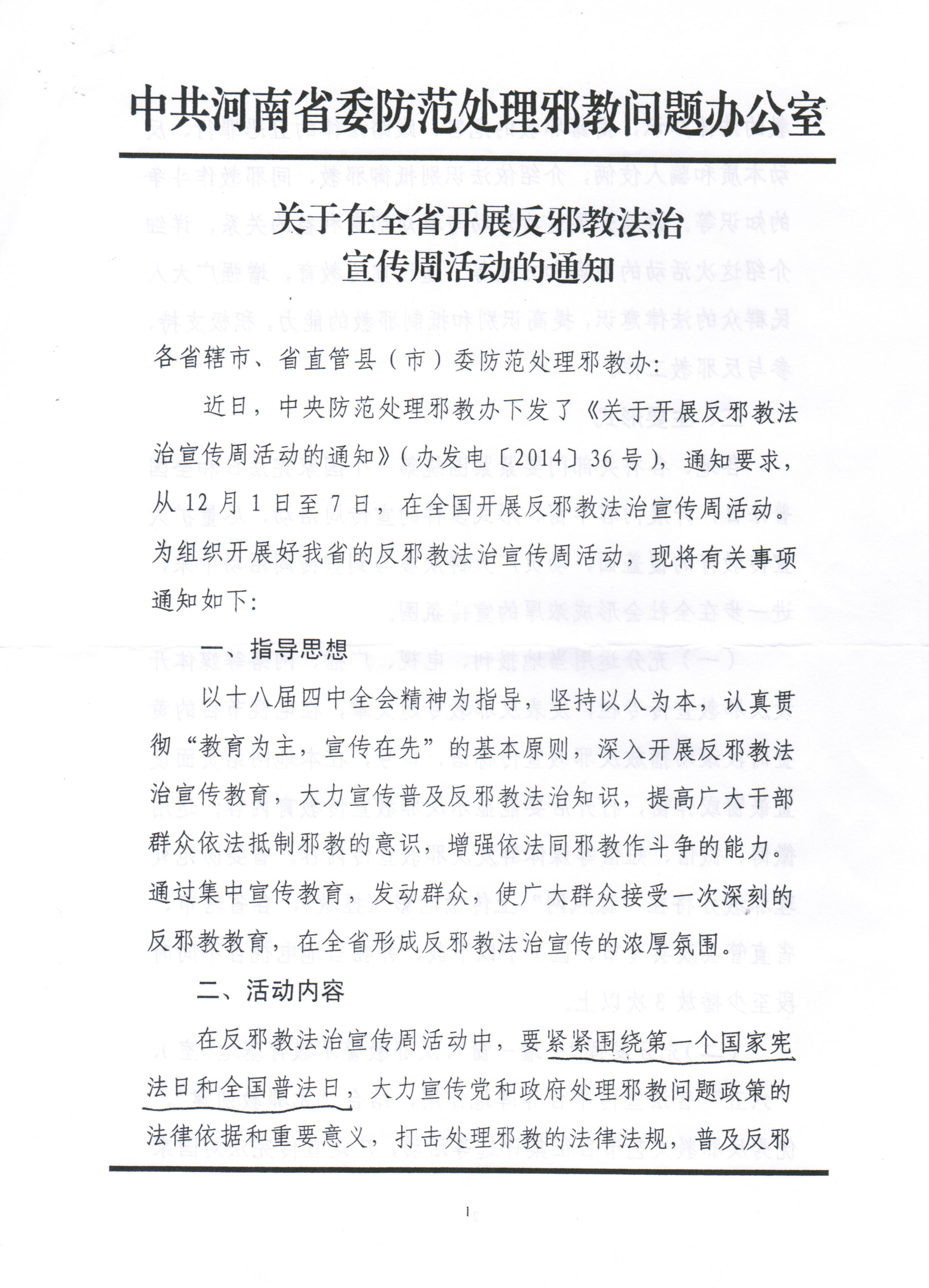關(guān)于在全省開展反邪教法治宣傳周活動(dòng)的通知
