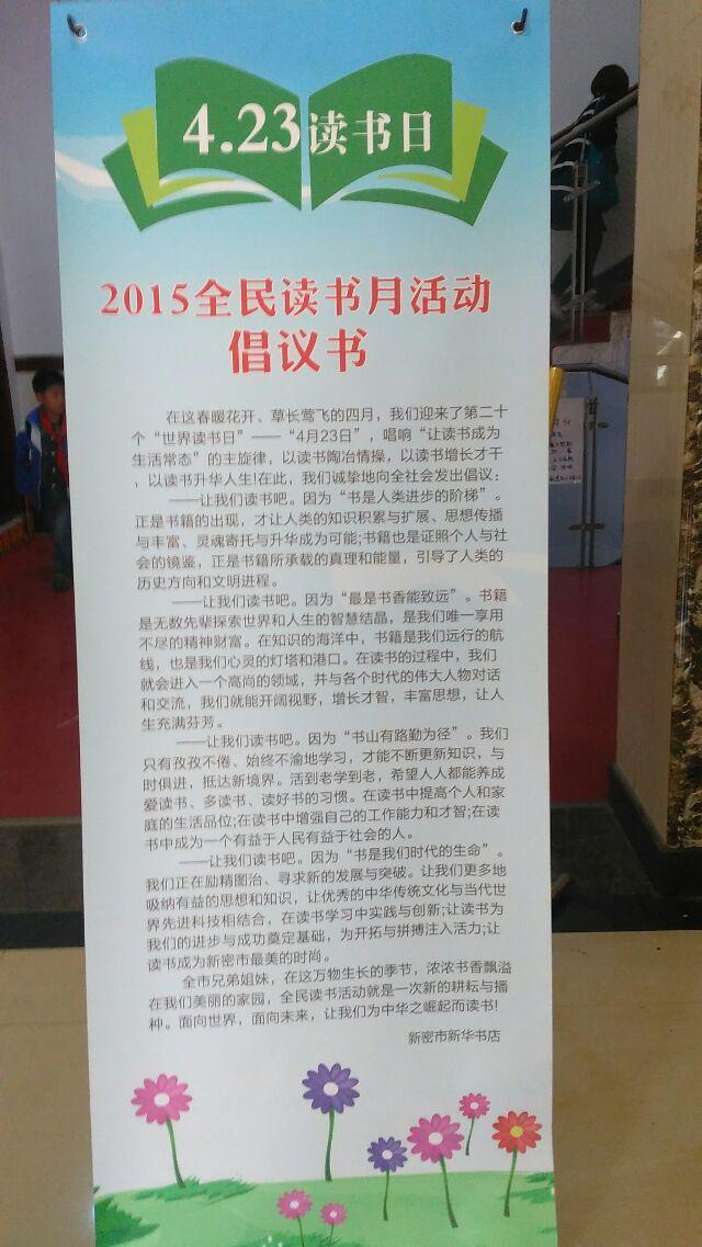 為更好營(yíng)造書(shū)香社會(huì),促進(jìn)社會(huì)閱讀風(fēng)尚的形成,提升民族文化素質(zhì),推進(jìn)學(xué)習(xí)型城市建設(shè),提高我店綜合收益,在4月23日世界讀書(shū)日來(lái)臨之際,新密市新華書(shū)店發(fā)出了2015年全民讀書(shū)月活動(dòng)倡議書(shū),提出了“美麗四月天,相約讀書(shū)日”閱讀主題,全力搞好宣傳,確保活動(dòng)取得實(shí)效,該店利用電子顯示屏、張貼海報(bào)、賣場(chǎng)布置等手段進(jìn)行宣傳,營(yíng)造氛圍,并積極組織開(kāi)展流動(dòng)售書(shū)活。