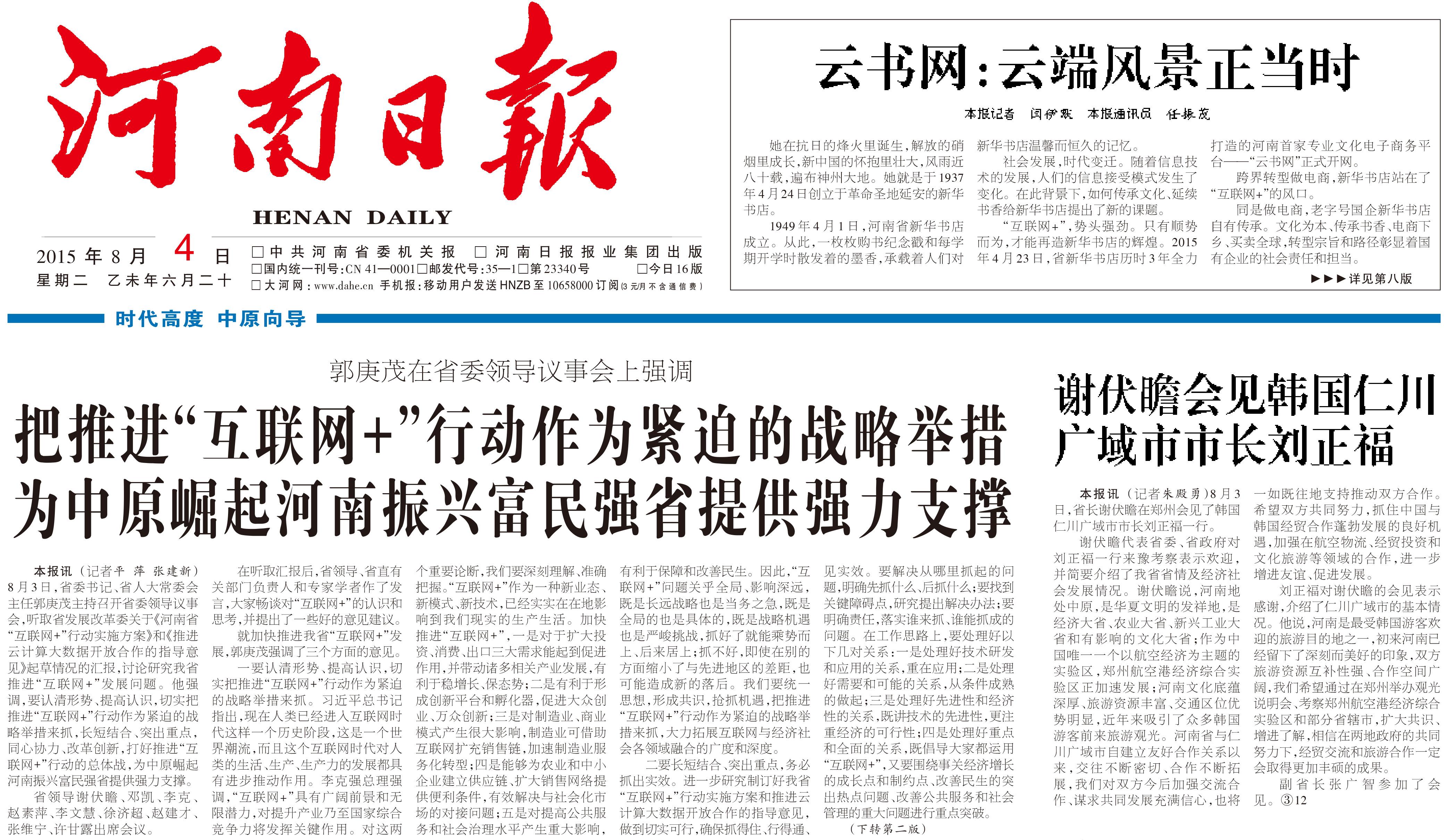 云書網(wǎng)報(bào)道與郭庚茂書記強(qiáng)調(diào)推進(jìn)“互聯(lián)網(wǎng)+”行動(dòng),同登《河南日報(bào)》頭版