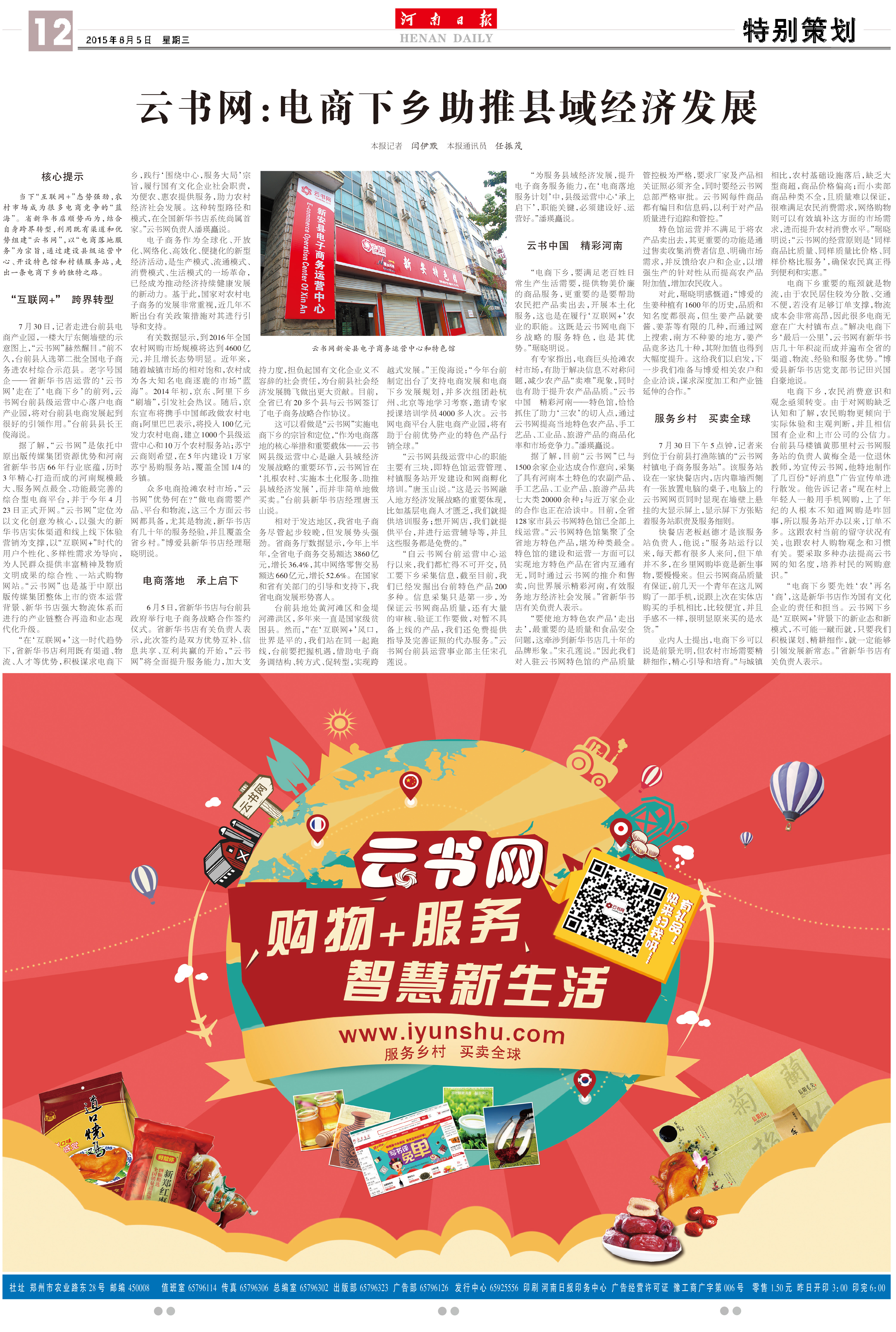 8月5日《河南日報(bào)》封底整版,對云書網(wǎng)電商下鄉(xiāng)助推縣域經(jīng)濟(jì)再次進(jìn)行宣傳報(bào)道。