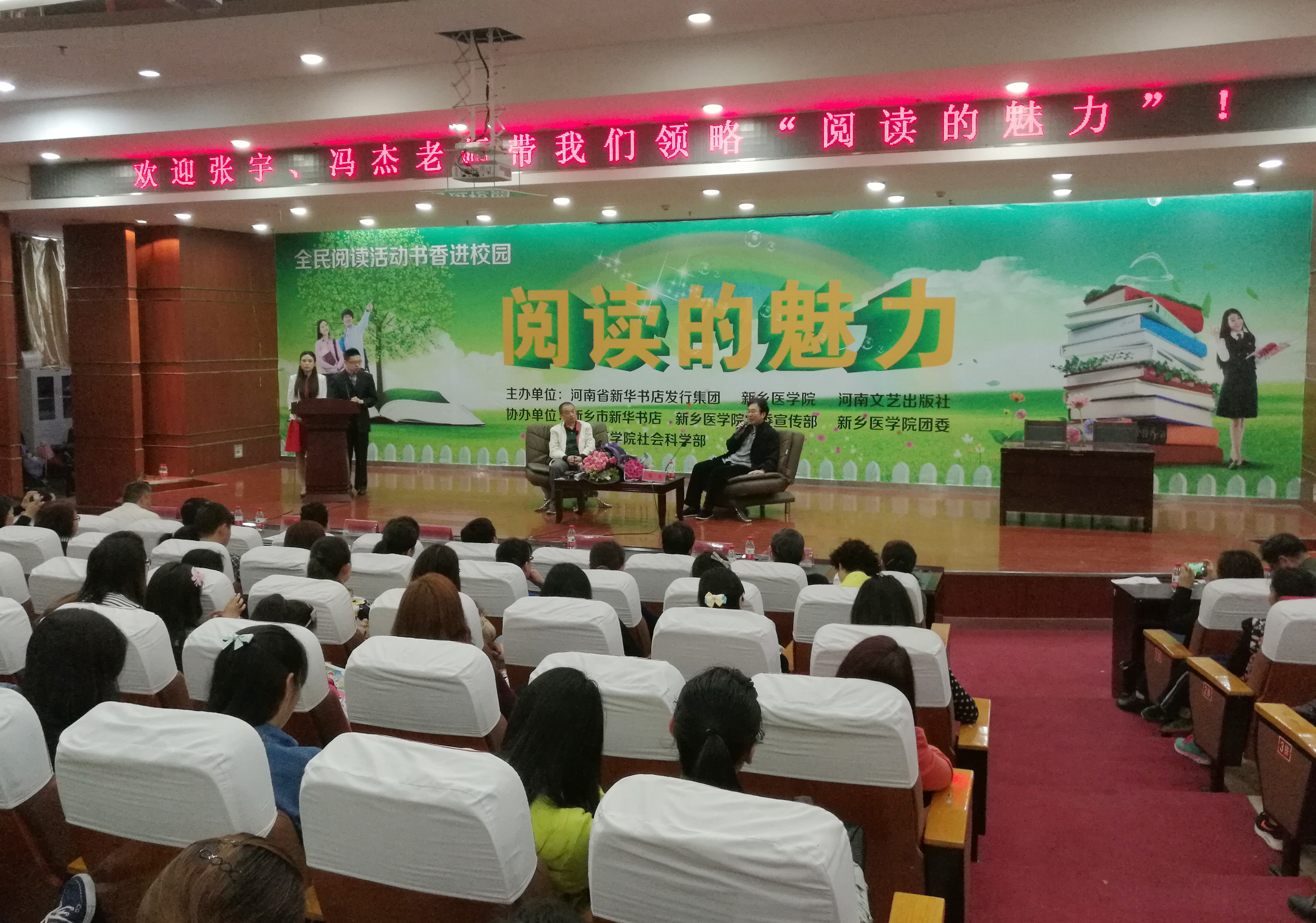 以世界讀書日為契機,為將全面閱讀活動引向深入,新鄉(xiāng)市店邀請河南省著名作家張宇、馮杰來到新鄉(xiāng)醫(yī)學院,與來自新鄉(xiāng)醫(yī)學院、新鄉(xiāng)市實驗小學、紅旗區(qū)實驗小學、河師大附中國際雙語小學和晨光讀書會的千余名師生、讀者暢聊“閱讀的魅力”。