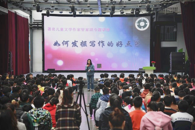 在“名家進校園”活動中,管家琪老師每到一所學校,都以自己如何與寫作結緣為引,談到自己獲得寫作題材的方法,鼓勵學生們在日常中多記錄,做好筆記,尋找發(fā)現(xiàn)的眼睛,結合寫作經(jīng)歷和生活小故事,以通俗易懂、風趣幽默的語言和豐富的人生經(jīng)歷,和學生共同分享閱讀和寫作中的感悟,教學生發(fā)揮想象,感受寫作帶來的樂趣。精彩互動環(huán)節(jié)中,管家琪老師以游戲的方式和孩子們玩起來寫作游戲。針對大家寫作方面的迷茫與困惑、管家琪老師與現(xiàn)場孩子們進行真摯而親切的交流,解答孩子們的困惑;顒蝇F(xiàn)場氣氛活躍,活動的最后管家琪老師還建議孩子們,在日常生活中,多閱讀名著以及積極向上的作品,它可以開闊視野,拓展思維,F(xiàn)場觀眾或積極提問、踴躍發(fā)言,或認真聆聽、認真記錄,現(xiàn)場洋溢著開心閱讀氣氛。在每次講座結束后,管家琪老師還饒有興趣地為喜歡自己作品的小讀者簽名留念。